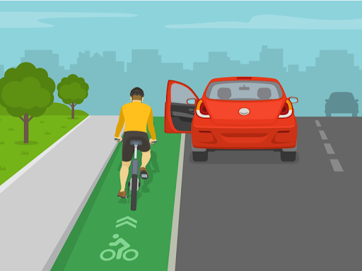 Dooring occurs when a cyclist collides with a parked car door that is opened in their path. This is unfortunately quite common in cities and can have serious consequences. Cyclists have little they can do to protect themselves from this type of collision for several reasons. The first is that it is extremely difficult to see whether there is a passenger inside of a parked car so there is usually no warning before the door is opened. Once it has been opened, the cyclist often does not have time to react and even if they do, swerving around the door is limited by passing car traffic.