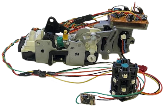 In order to prevent the door from opening, we retrofitted the lock of an existing door with a servo motor and a mechanism to actuate the child lock. This meant that we could disengage the door handle from the door latch, effectively preventing someone from opening the door even when they pull on the handle. We also incorporated a LED light to signal when there was an impending collision.The full system, removed from the door, can be seen in the title image.