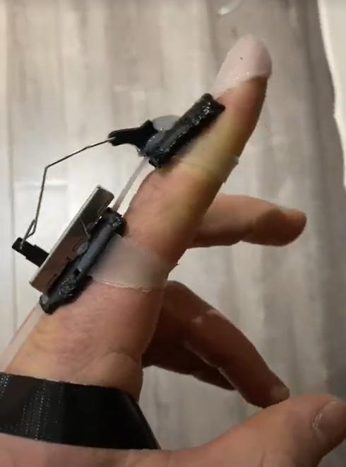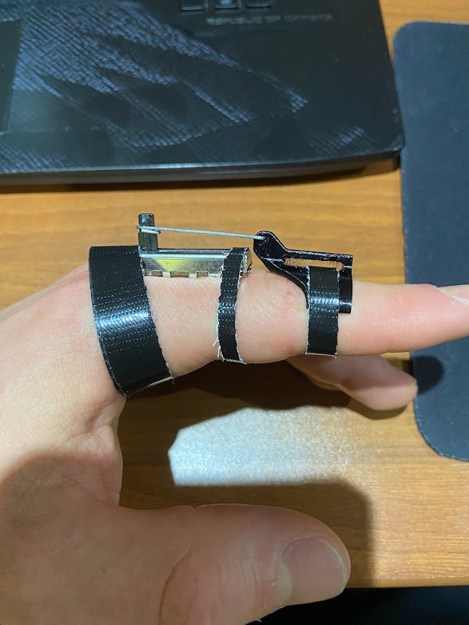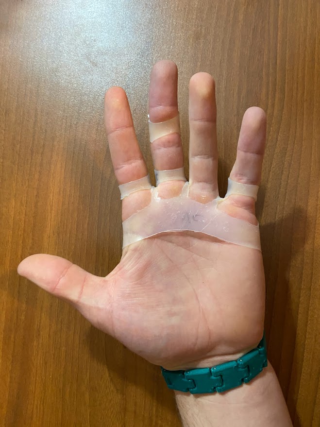 Based on the gaps I saw, I had several vague goals for the first prototype and also an idea of some properties I would like to see in a final version. For the initial prototype, I wanted to verify the viability of an on-finger sensor and see how natural that felt. I decided to keep all of the sensors on the back of the hand and to keep the glove part as minimal as possible. I also had the idea that the first iteration of the design should be comfortable and something I could actually use, however, I will discuss later why this was a significant error.